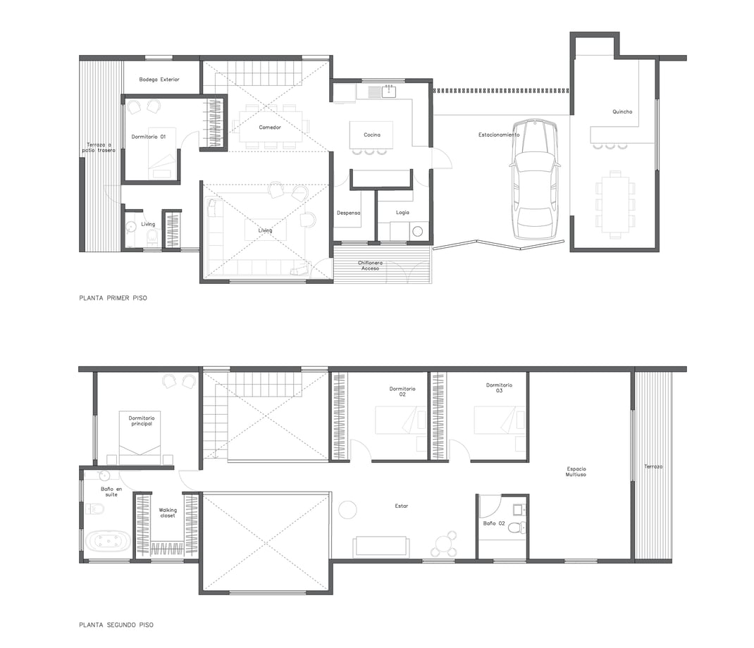 Estacionamiento, Quincho, Chiflonera, Living, Comedor, Baño 01 y 02, Bodegas, Cocina, Despensa, Logia, Dormitorio 01